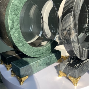 ADL New Design Round Crystal Glass Award Trophy with Green Black White Stone Base with Metal