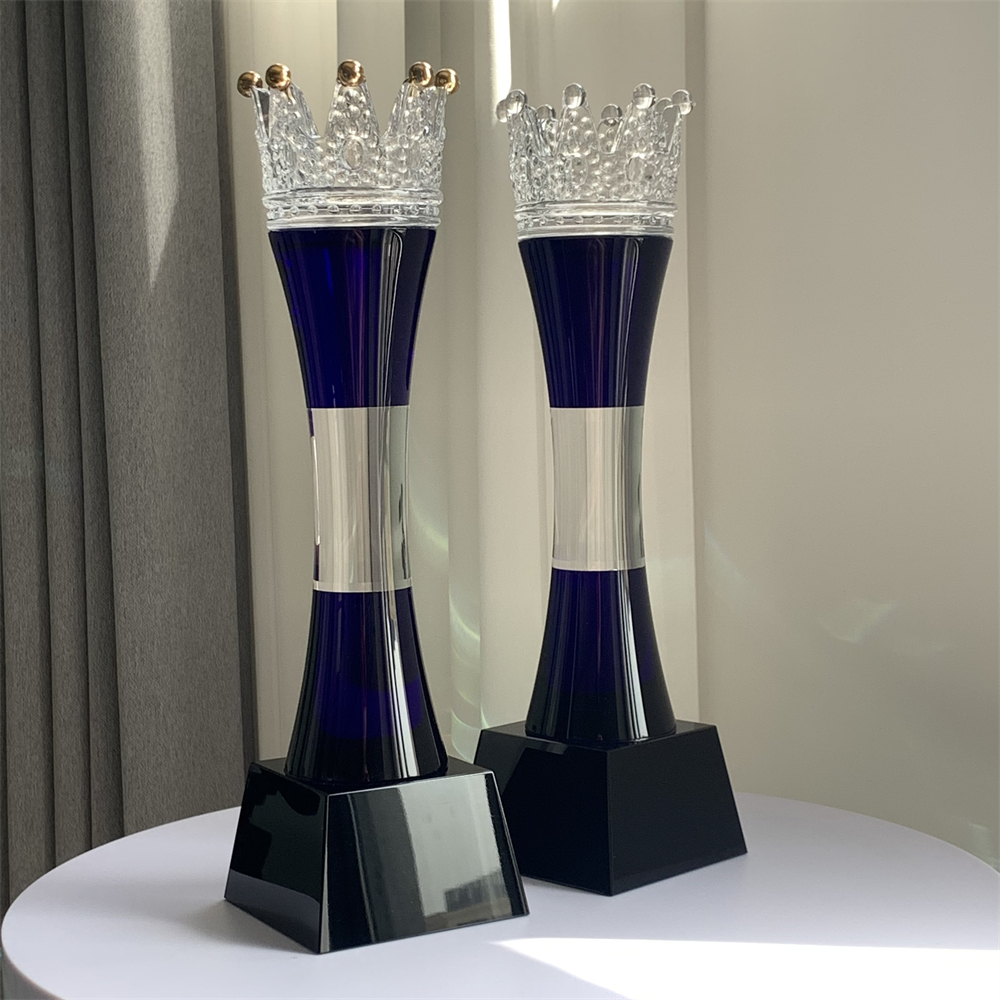 ADL Crown Crystal Glass Trophy with Blue Pillar Gold Crown for Performance Trophy No.1 Trophy Awards