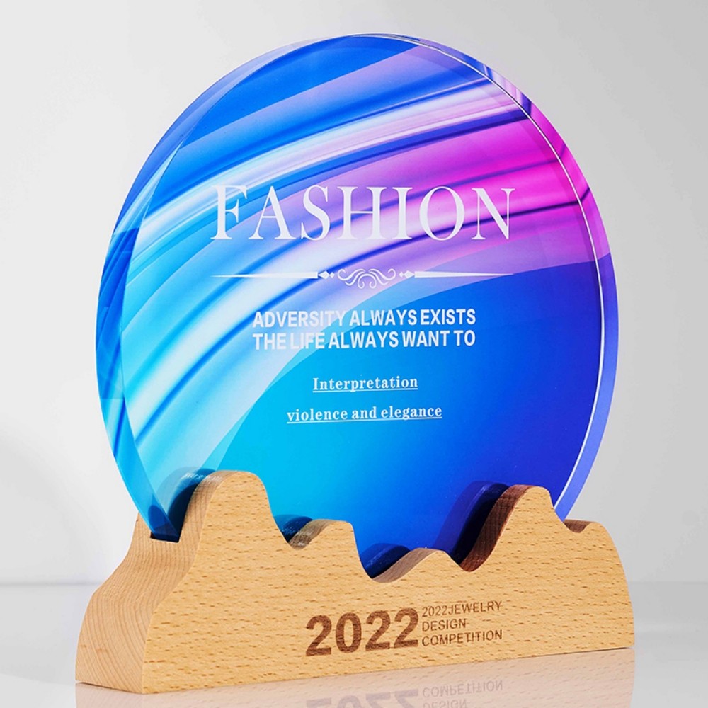 ADL 2023 New Design Crystal Glass Trophy with Wooden Base with Colorful Background Customized Logo and Words