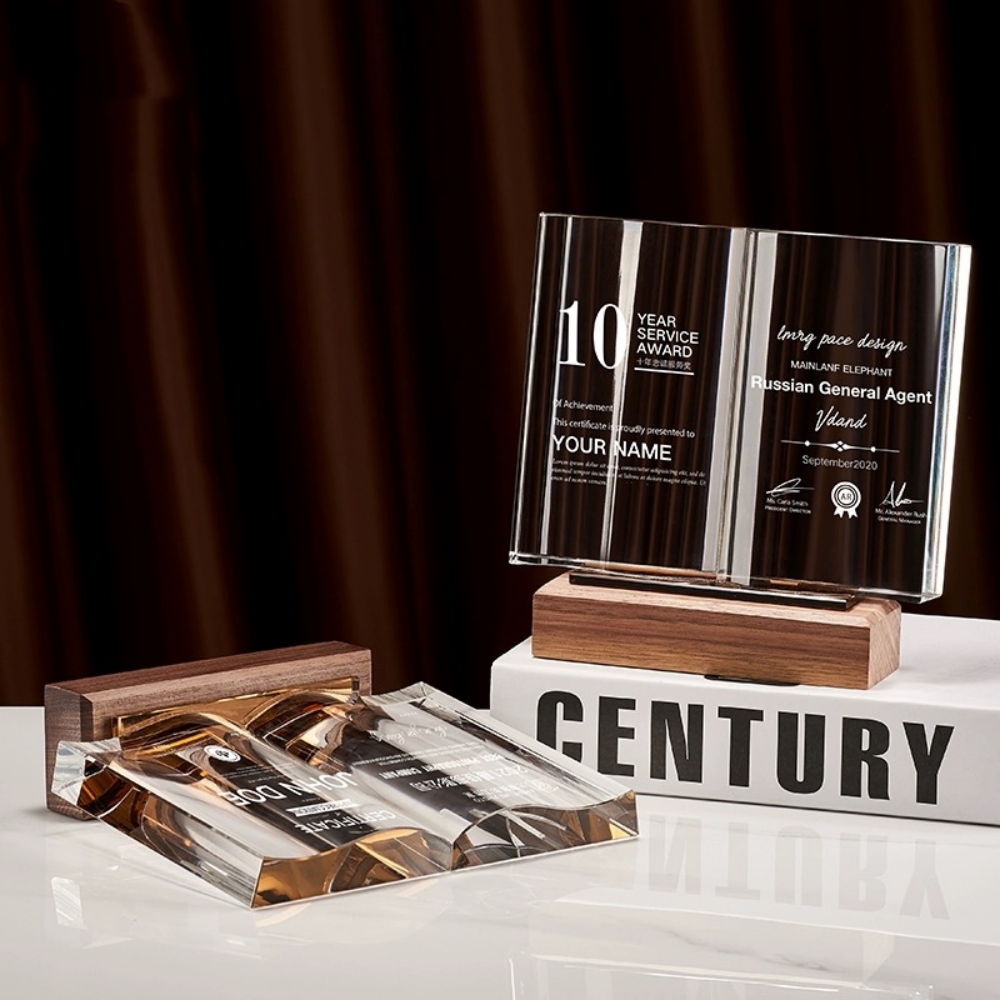ADL Classic Wooden Plaques Book Trophy Awards Crystal Glass Laser Trophy with Engraved Customized Logo Words Trophy for Souvenir