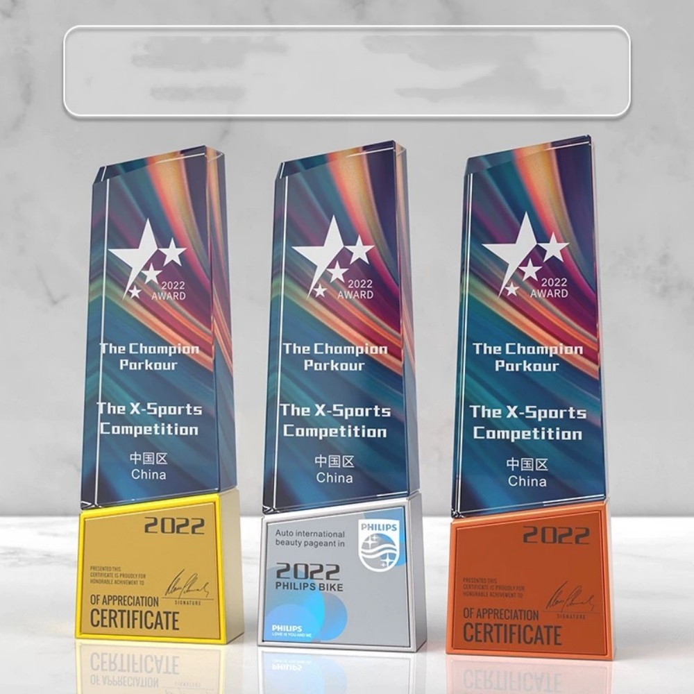 ADL Customized Business Trophy Metal Crystal Glass with Colorful Background Laser Printed Logo 'Love' Theme Model K9 Made China